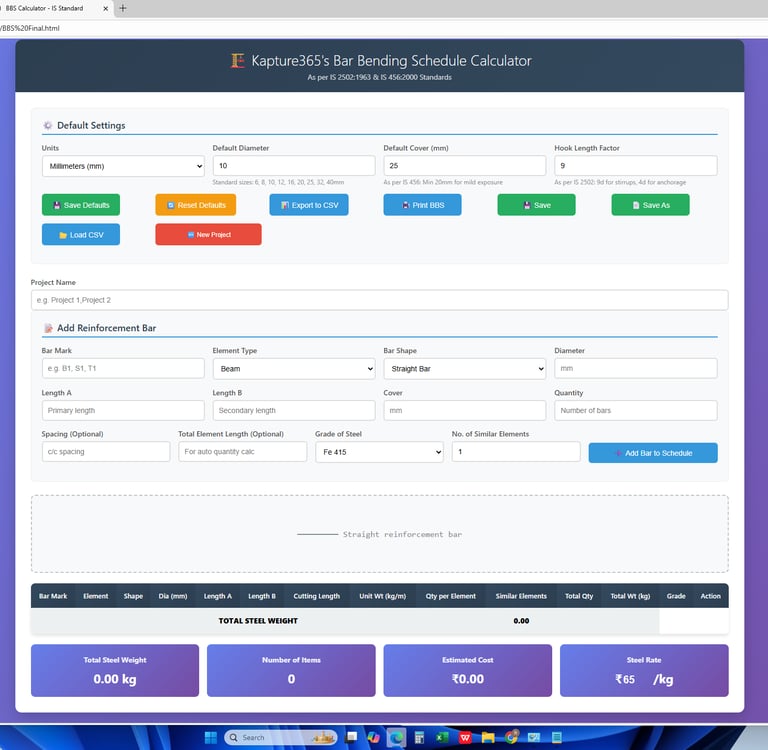 The Kapture365 BBS Calculator App is designed for quick, professional-grade bar bending schedule creation with minimal input and maximum accuracy — as per IS standards.